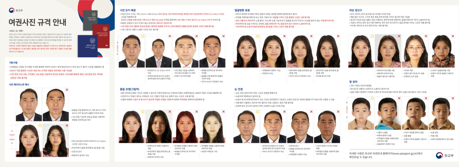 여권사진의 규격은 국제민간항공기구(ICAO)에서 정한 기준을 따르고 있습니다. 여권은 해외여행 시 인정되는 유일한 신분증으로 여권사진은 본인임을 확인하는데 매우 중요한 요소입니다. 여권사진은 여권발급 신청일 전 6개월 이내 촬영된 사진으로 본인임을 확인할 수 있도록 실제 소지인을 그대로 나타내어야 하며, 변형하여서는 안됩니다. 여권사진 규격에 적합하지 않은 사진을 제출하여 여권접수가 지연 또는 반려되거나 출입국 심사(자동출입국 시스템 포함)시 불편을 겪지 않도록 아래 기준에 맞는 적합한 사진을 제출하여 주시기 바랍니다.
