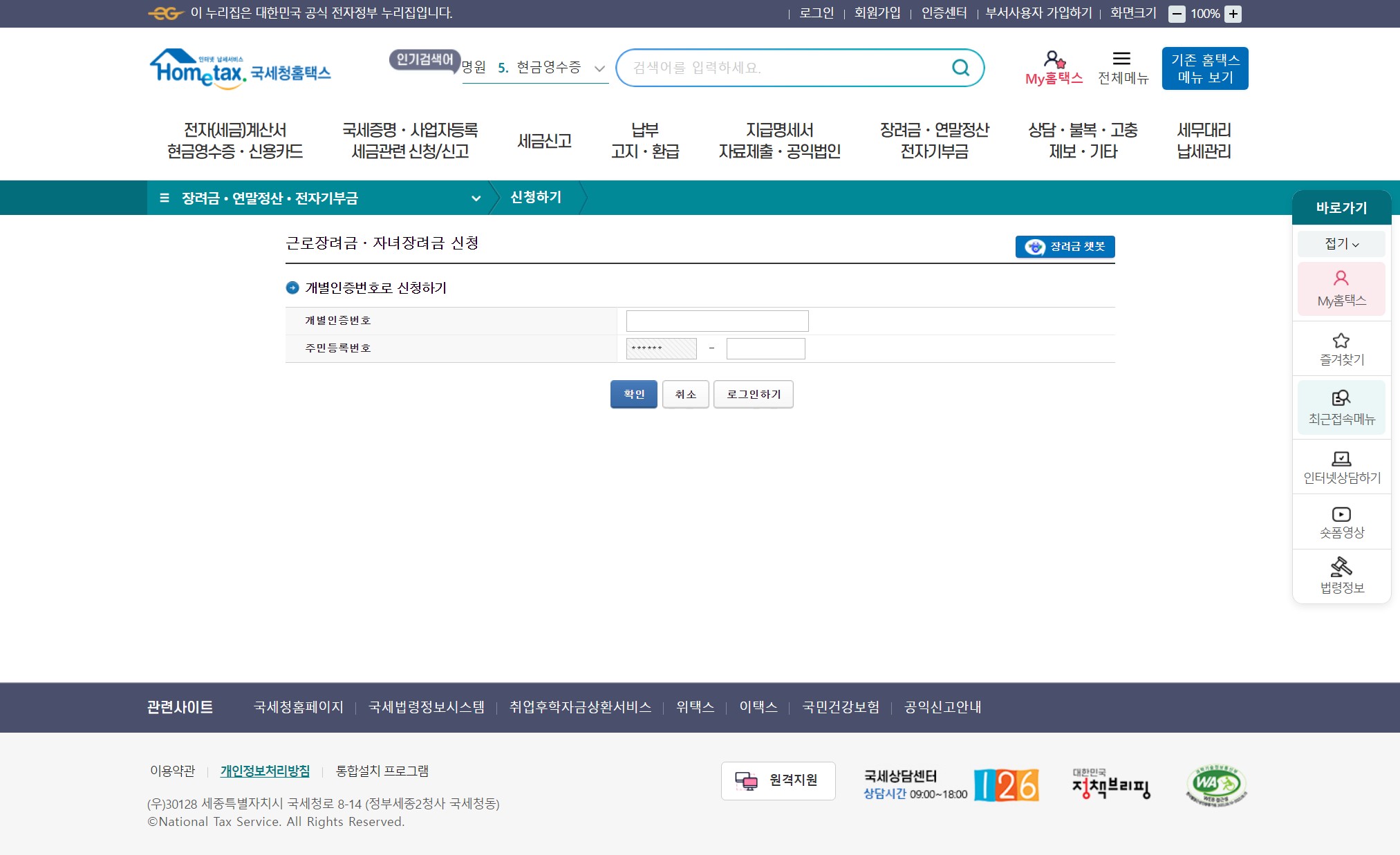 ▶장려금·연말정산·전자기부금 > 근로·자녀장려금 정기신청 또는 근로·자녀장려금 반기신청 > 직접입력 신청 * 간편 로그인 등 로그인 후 가구, 소득 등을 직접 입력하여 신청을 완료합니다.